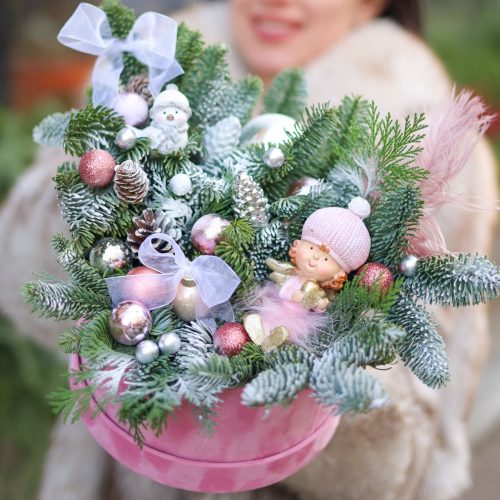 Состав: новогодний декор, нобилис, шишки, туя, фигурки девочки и птички.