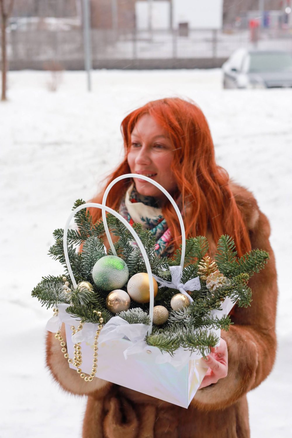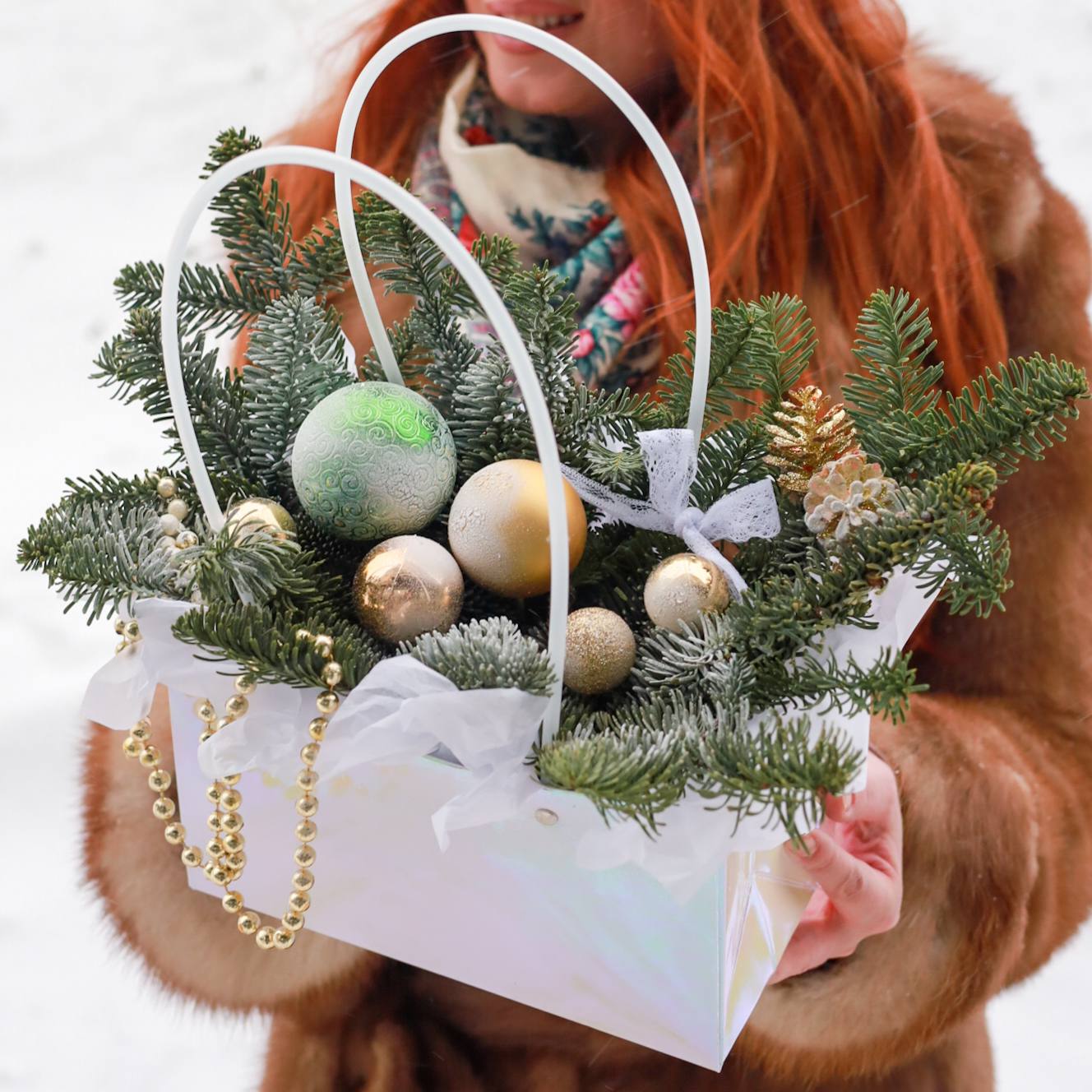 Состав: ель нобилис, елочные игрушки, бусы, шишки.