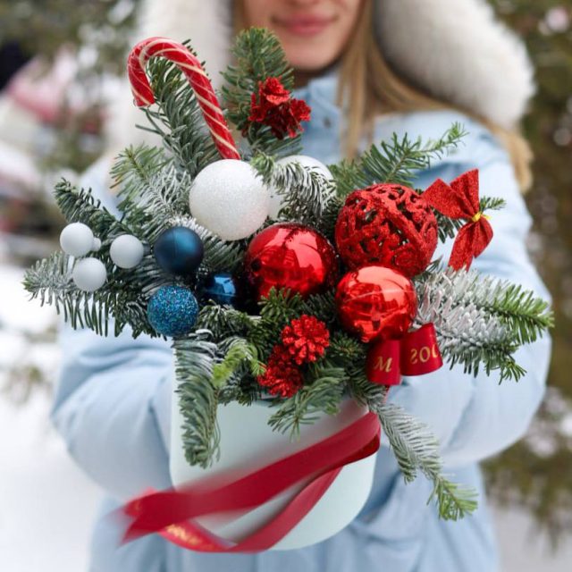 Композиция нобилиса , декоративных игрушек и леденца в шляпной коробке.