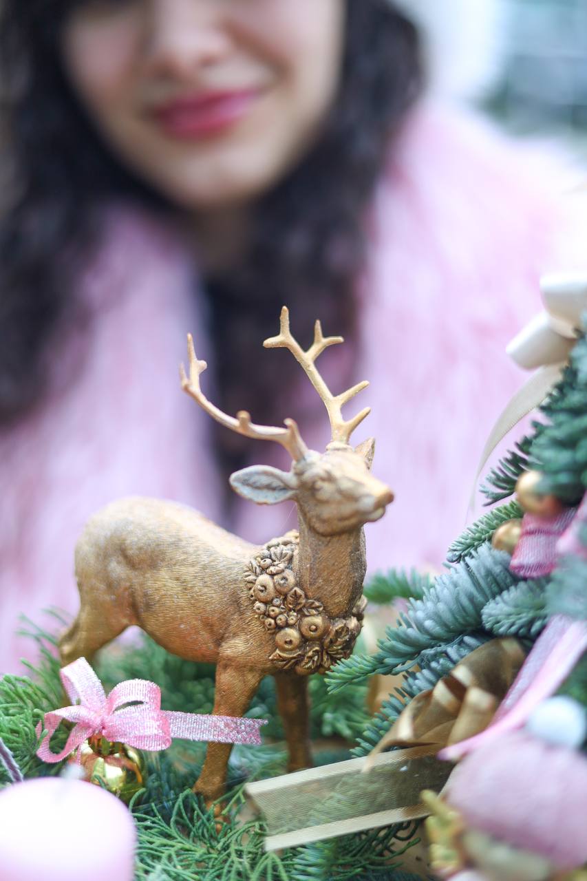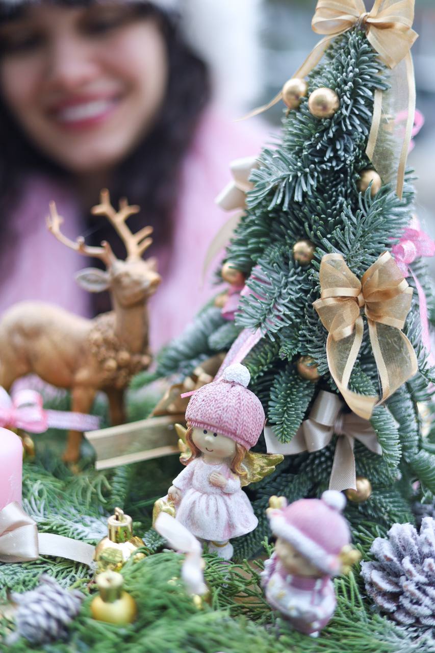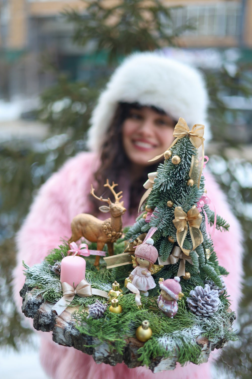 Состав: елочные игрушки, ароматная туя, свеча, датская ель нобилис, фигурки оленя и девочек.