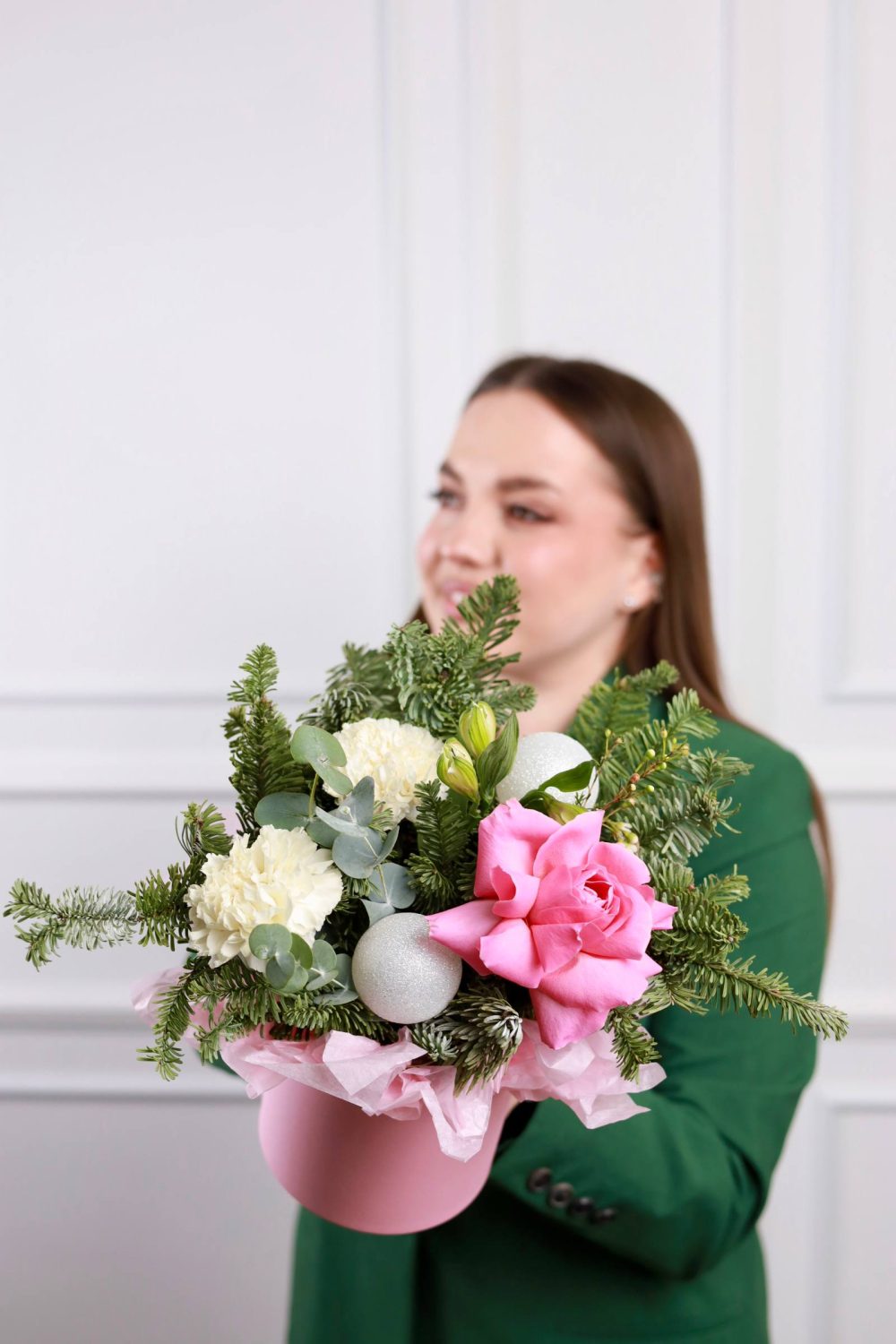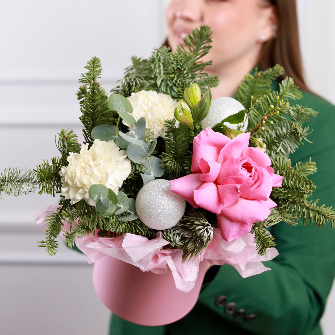 Милая зимняя композиция с французской розой, стойкими диантусами, альстромерией и елью нобилис.