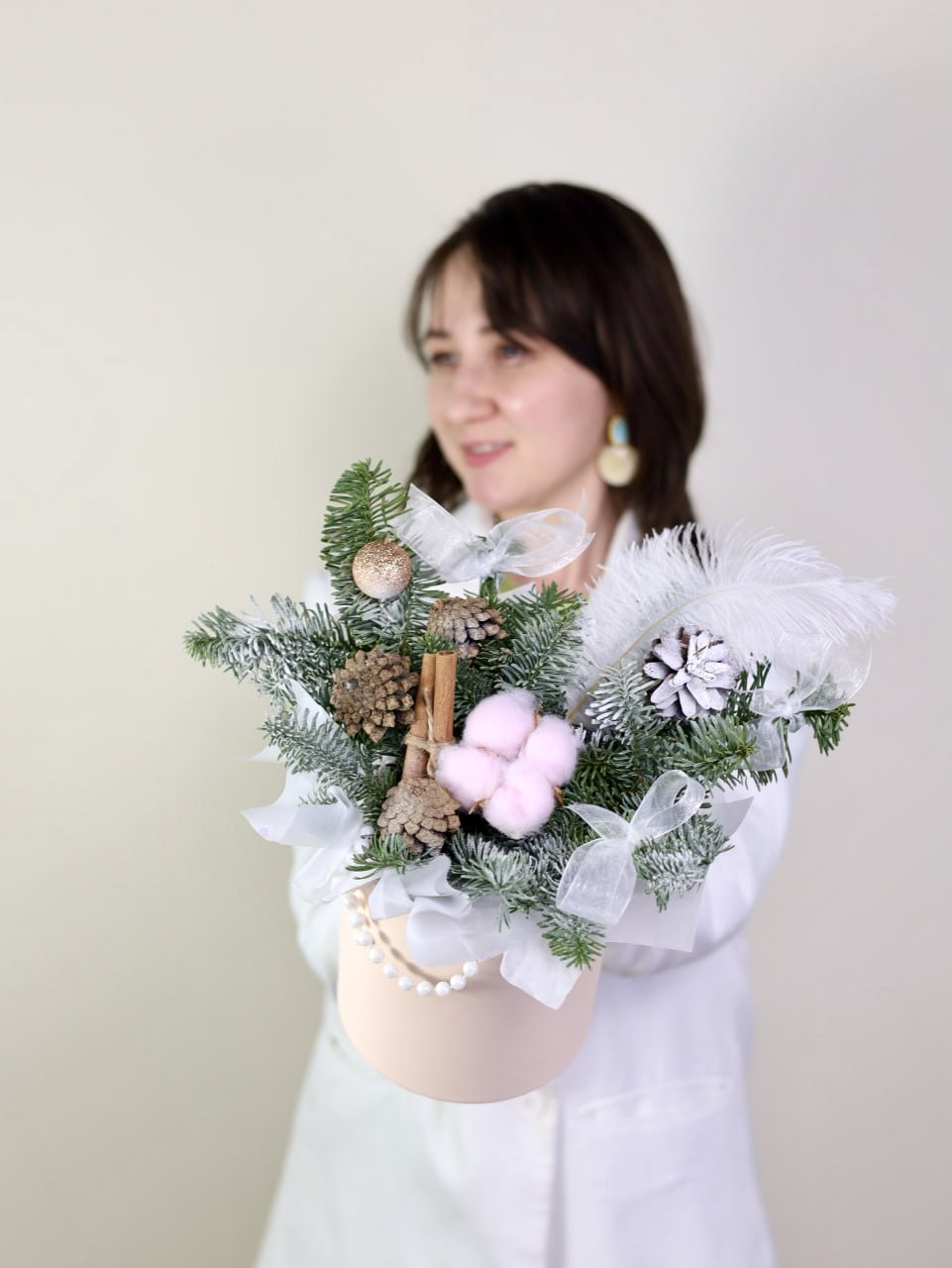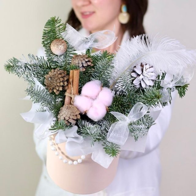 Милая композиция с елью, хлопком, корицей, шишками и декором.