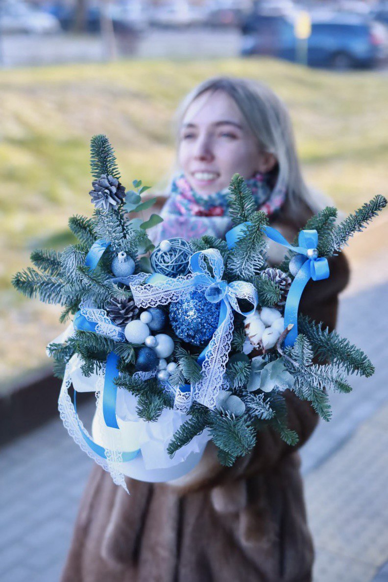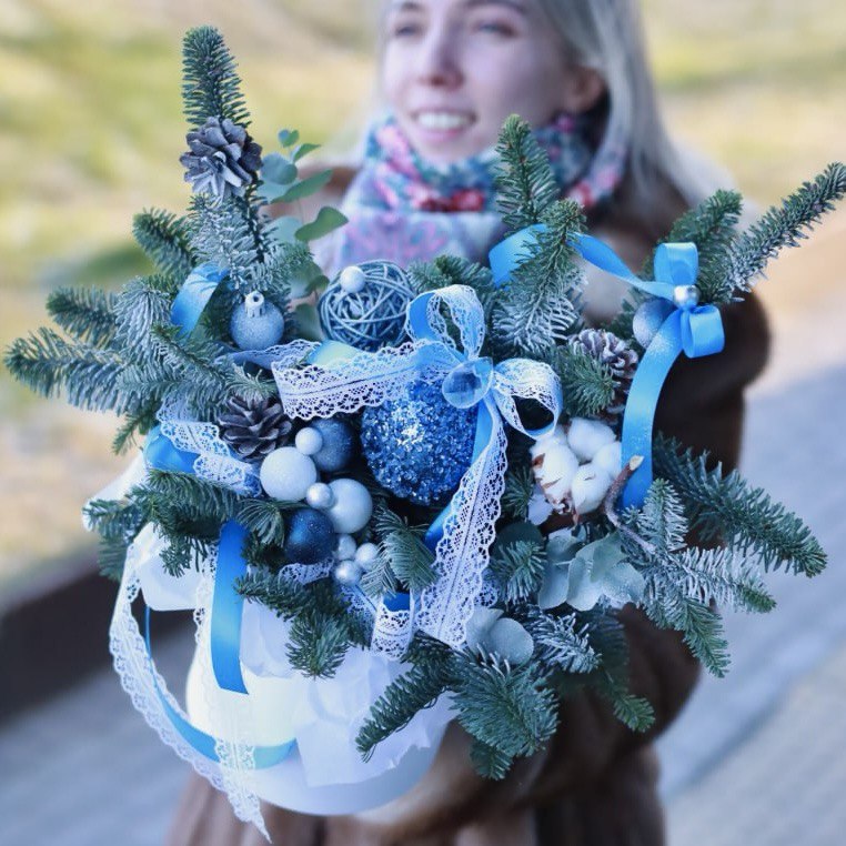 Красивая зимняя композиция в сине-голубой гамме в шляпной коробке.