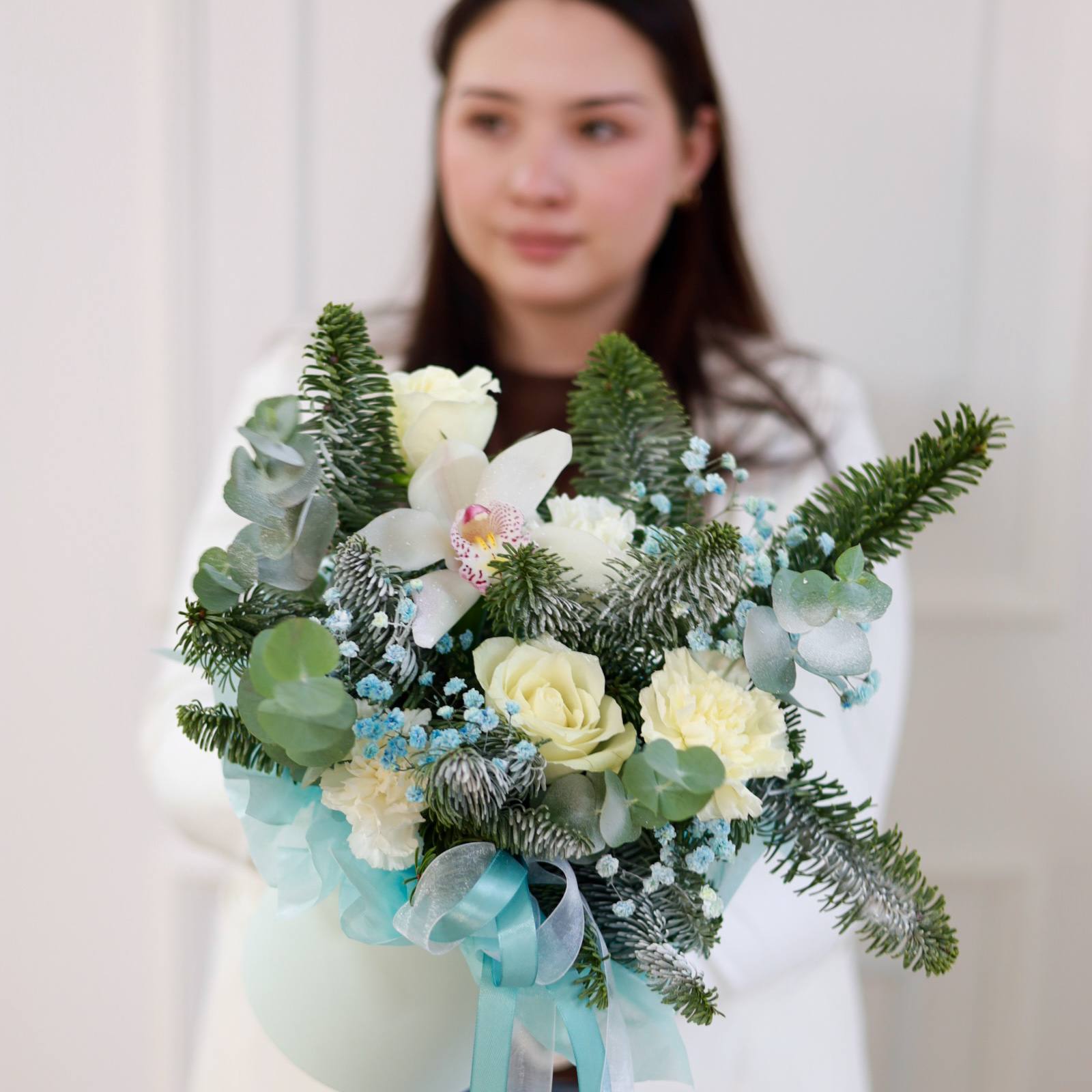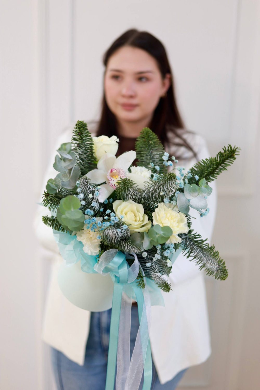 Красивая и очень стойкая композиция с орхидеей, розами, нобилисом, гипсофилой, диантусами и зеленью.