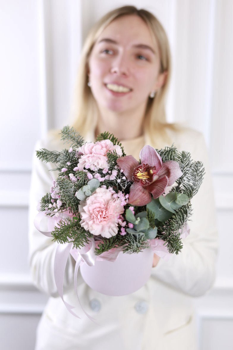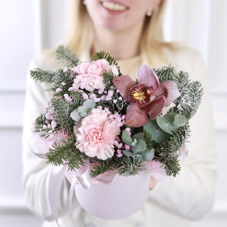 Красивая и очень стойкая композиция с орхидеей, диантусами, нобилисом, зеленью и гипсофилой. Высота около 23 см.