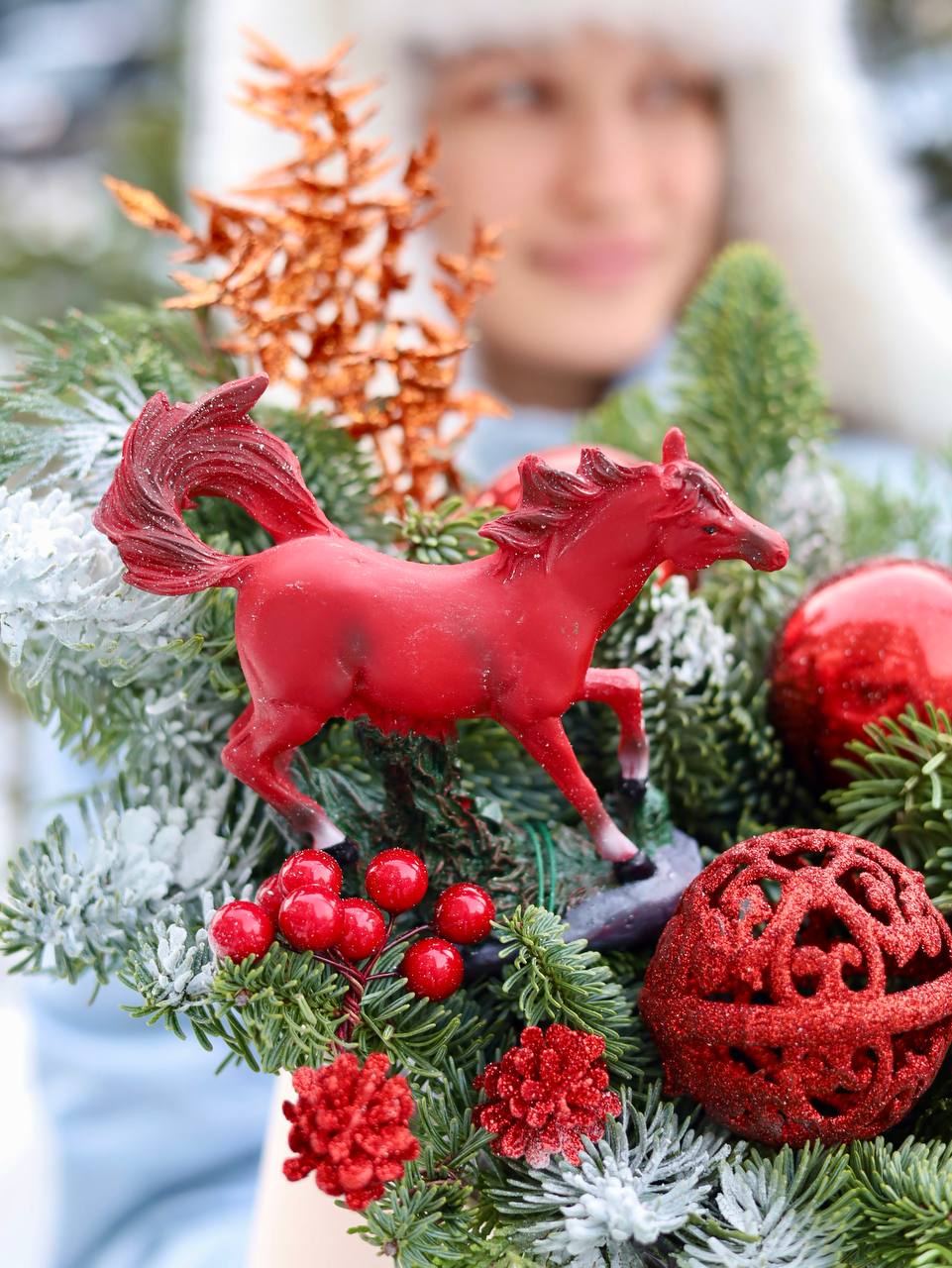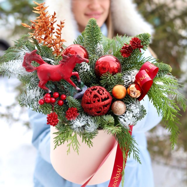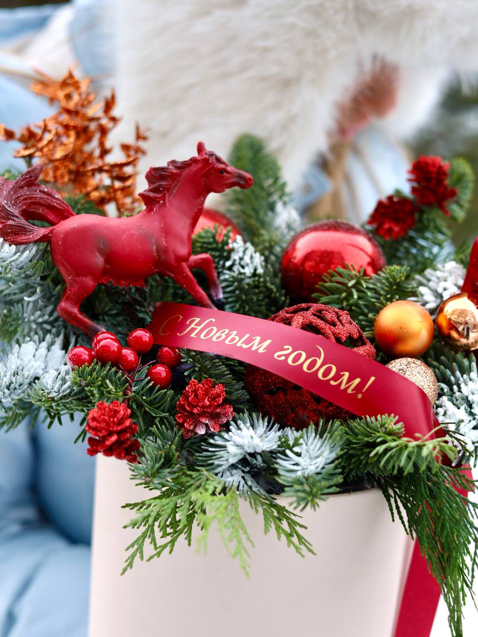 Состав: ароматная ель, туя, елочные игрушки, шишки, фигурка символа года Огненная Лошадь.