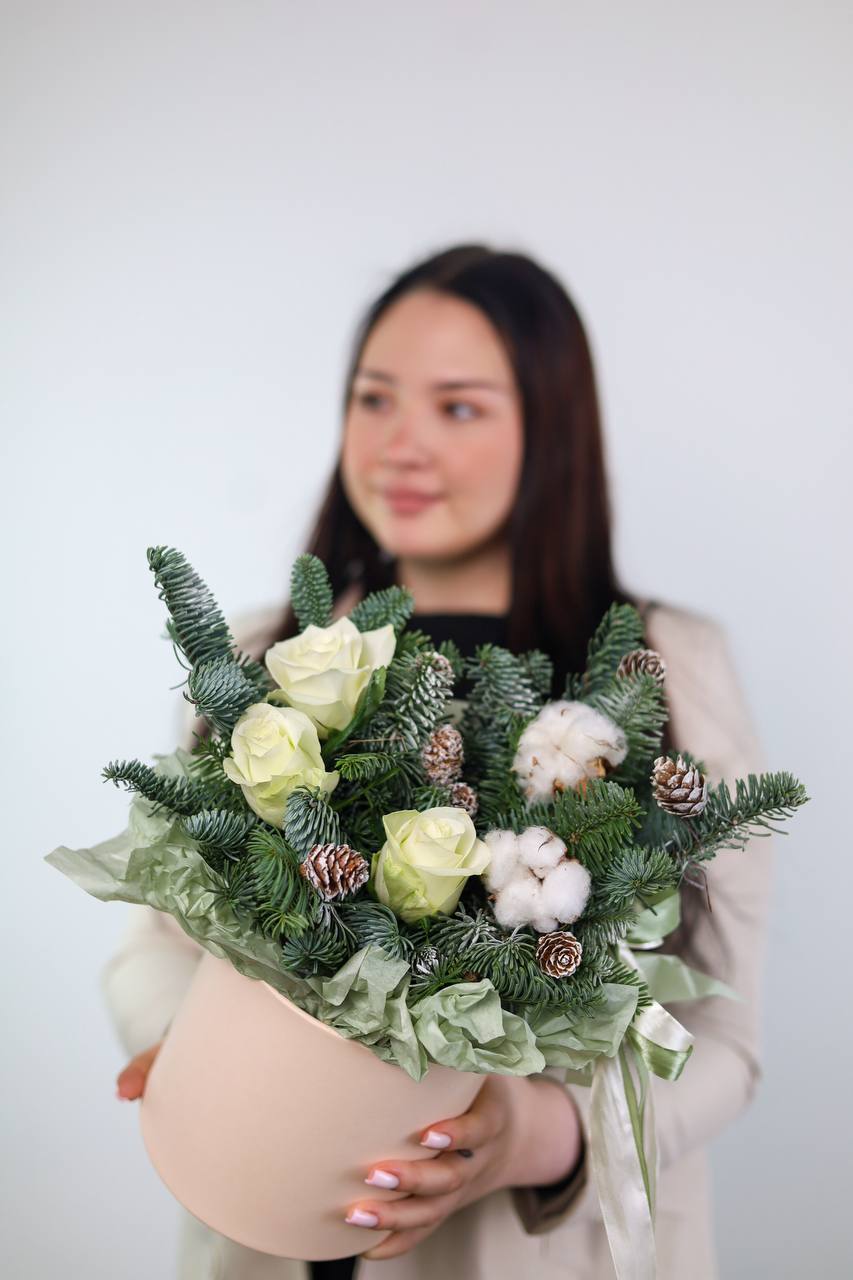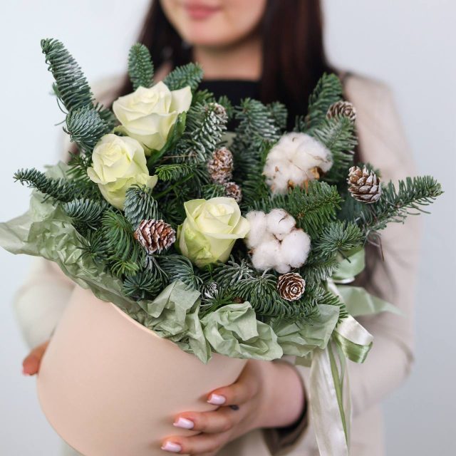 Композиция нобилиса, роз, воздушного хлопка и шишек в шляпной коробке.