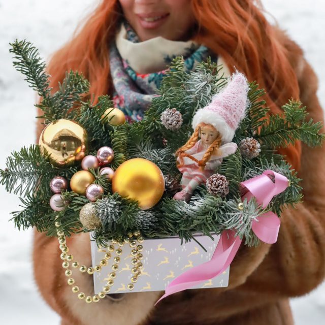 Очаровательная зимняя композиция в розовой гамме в коробочке.